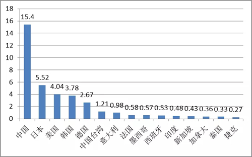 圖2 2018年工業(yè)機(jī)器人銷量排名前15市場(chǎng)(單位:萬臺(tái)),資料來源:ifr,中國電子學(xué)會(huì)整理